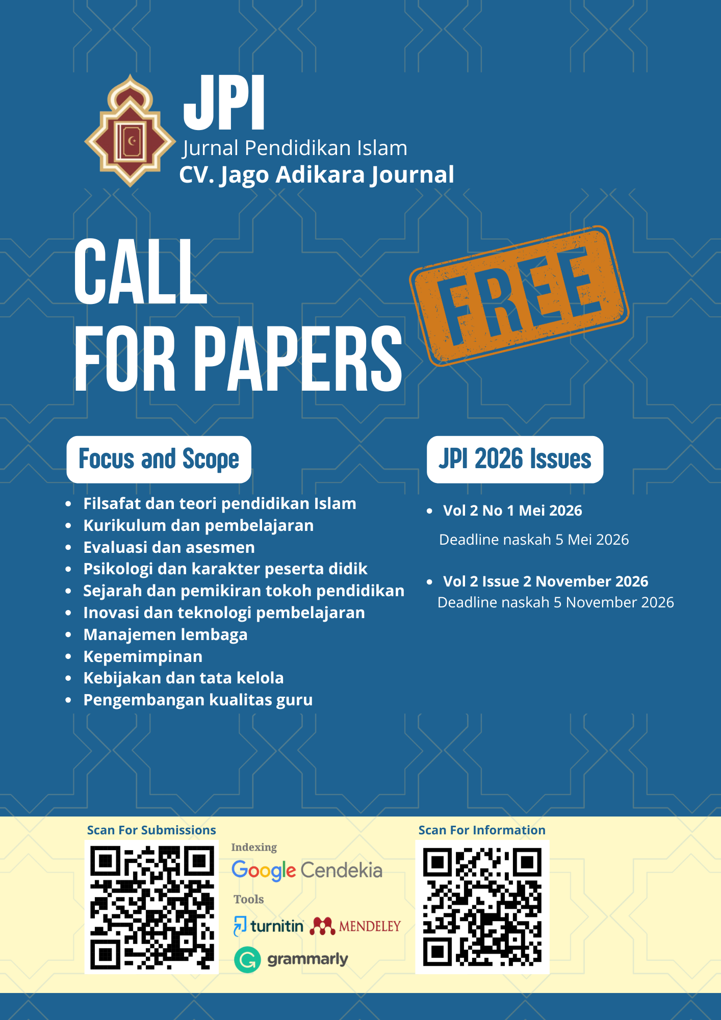JPI: Jurnal Pendidikan Islam adalah jurnal ilmiah yang mempublikasikan hasil penelitian dalam bidang pendidikan Islam, mencakup studi lapangan maupun kajian kepustakaan. Jurnal ini terbit dua kali (Mei dan November) dalam setahun dan seluruh naskah melalui proses peninjauan sebaya oleh para pakar. JPI menerima artikel yang belum pernah dipublikasikan dan tidak dalam proses penilaian di jurnal lain. Pengiriman naskah dilakukan melalui OJS sesuai Petunjuk untuk Penulis.